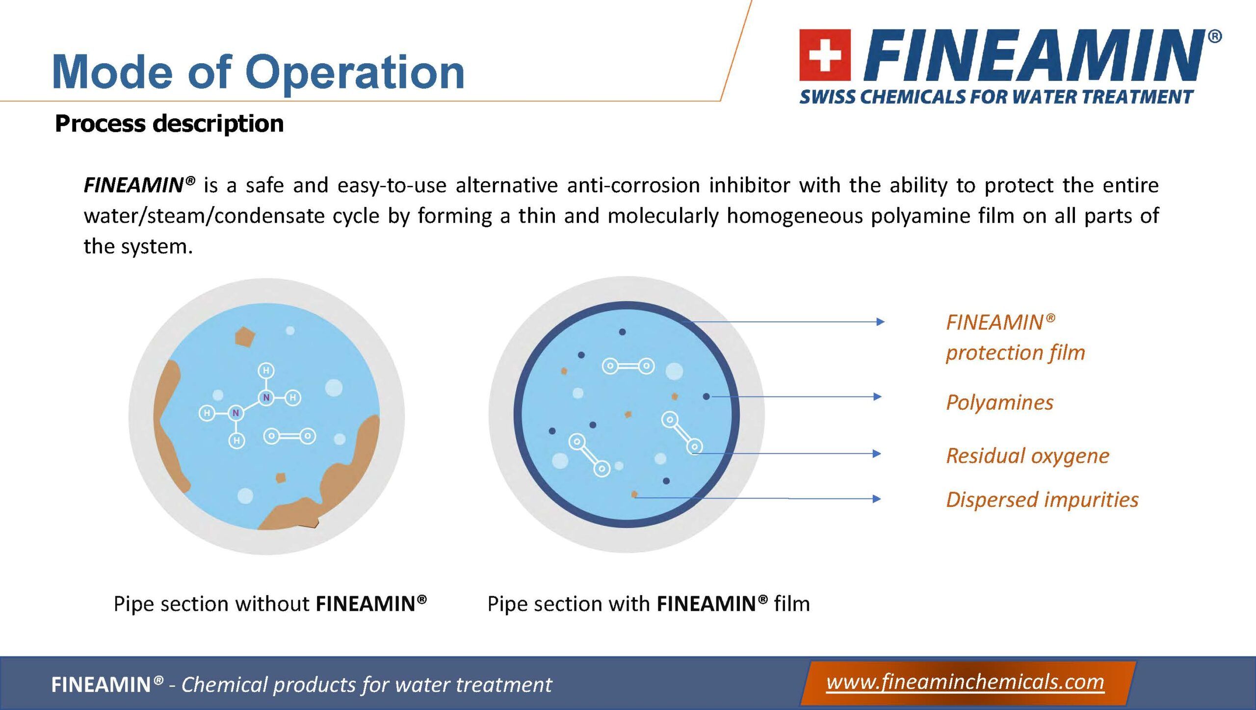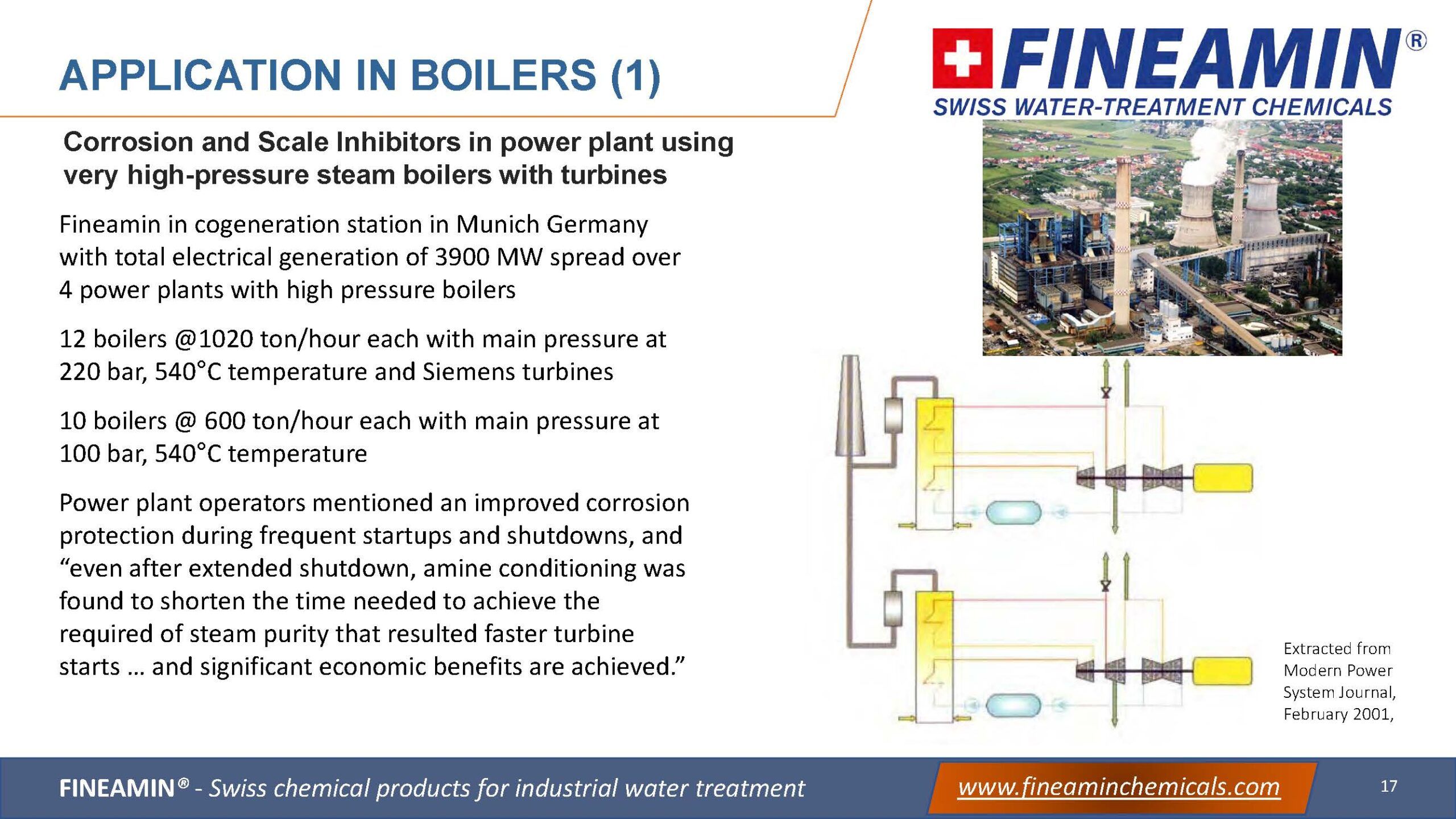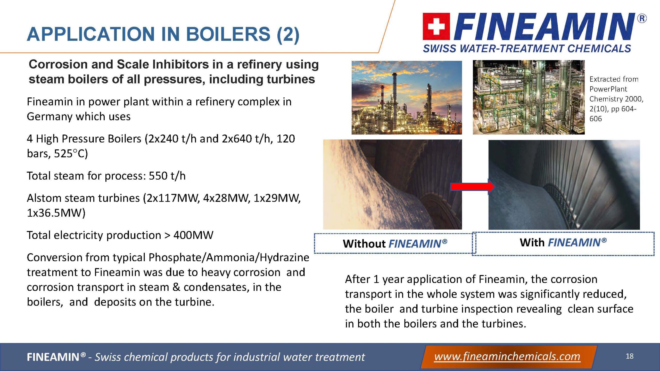 Fineamin is a Swiss-engineered water treatment solution designed to address corrosion and scale challenges in high-pressure boilers across power plants, refineries, and industrial facilities. Its innovative formulation has demonstrated significant improvements in operational efficiency, equipment longevity, and cost savings in diverse applications.